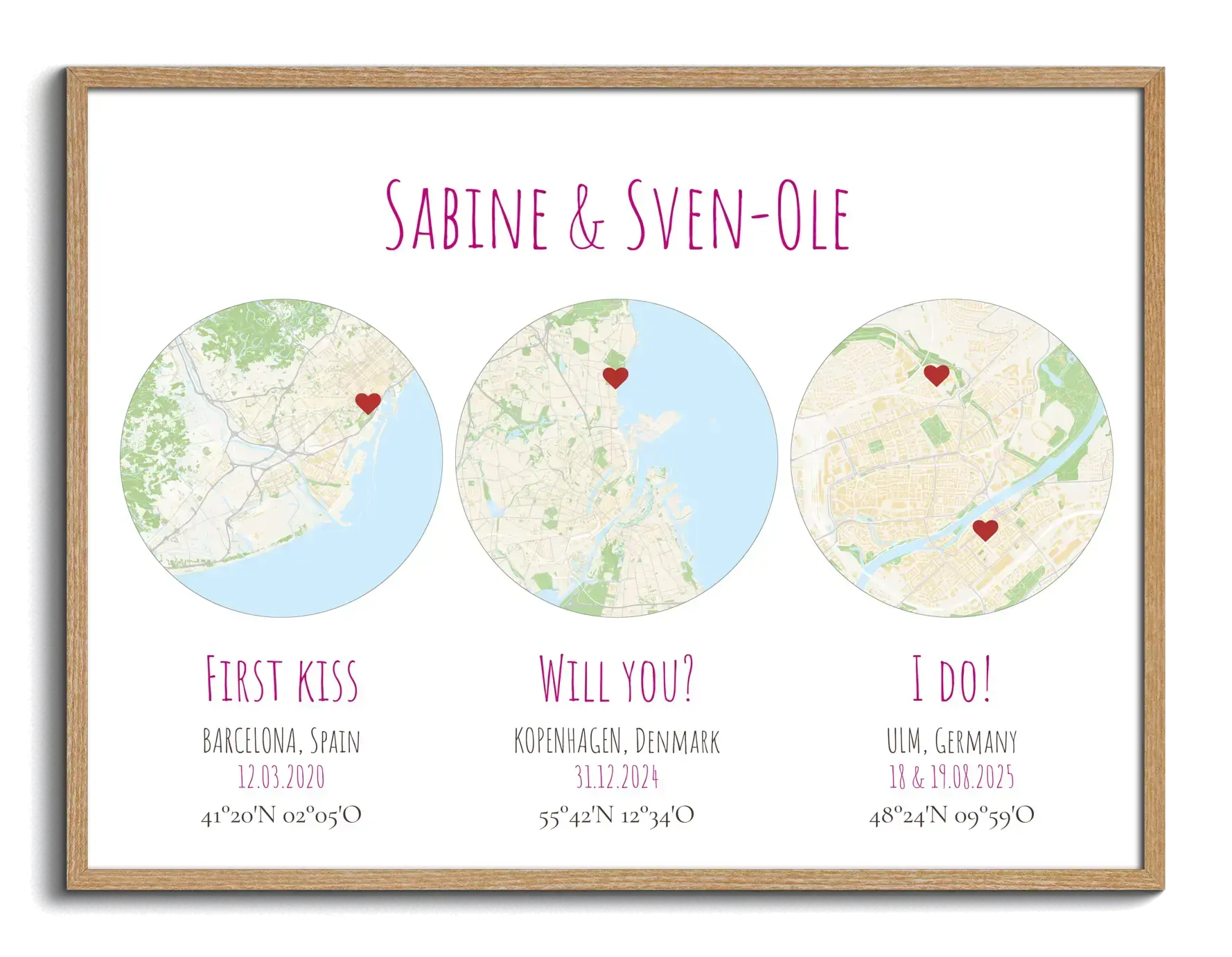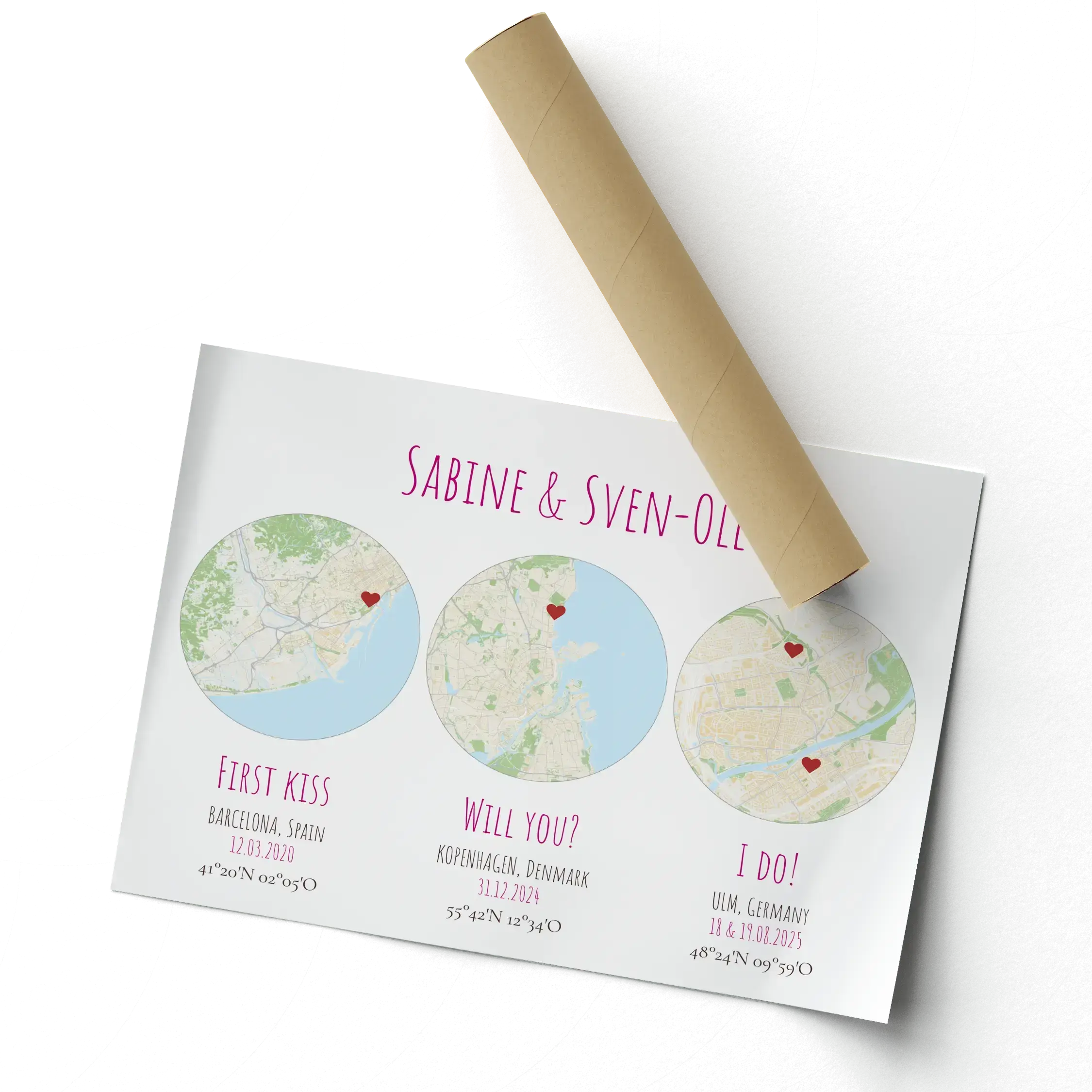 Ideal para regalar: el mapa del primer beso, la propuesta y la boda; un aniversario con vuestros tres momentos; el recuerdo de un viaje; el nuevo hogar; el lugar de nacimiento; o un detalle de boda para sorprender a la pareja. Personaliza nombres, frases, ciudades, fechas y colores a tu gusto.