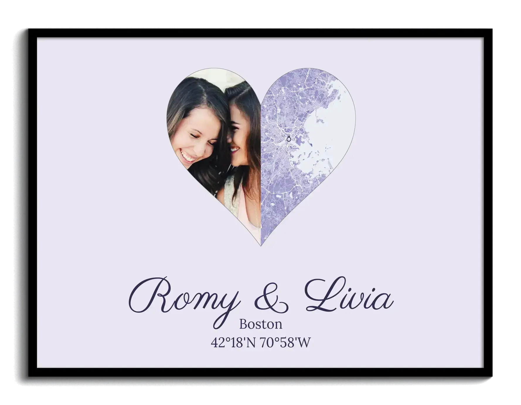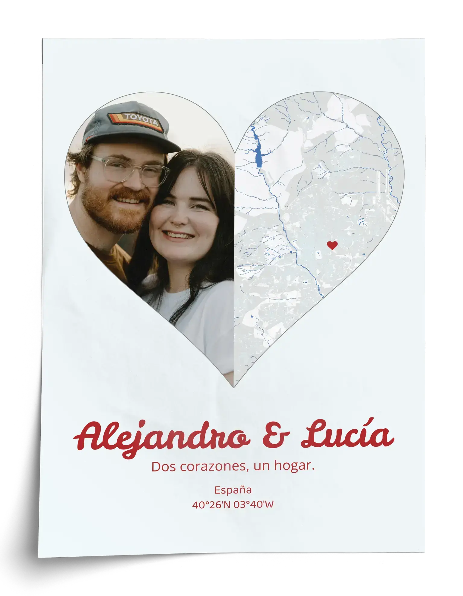 Crea ahora tu impresión y pídela al instante: este ejemplo es un corazón en diseño split, donde una mitad muestra tu foto y la otra una ciudad en forma de mapa con el lugar marcado. Debajo puedes añadir nombres, fecha, coordenadas o una frase corta. Todo se ajusta a tu historia, en el estilo y tamaño que prefieras.