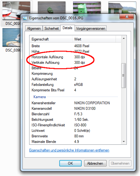 La especificación de la resolución en el diálogo de propiedades de un archivo gráfico en el Explorador de